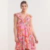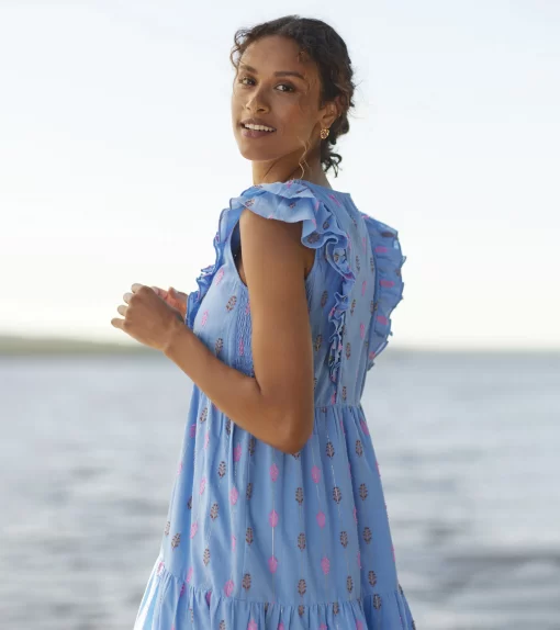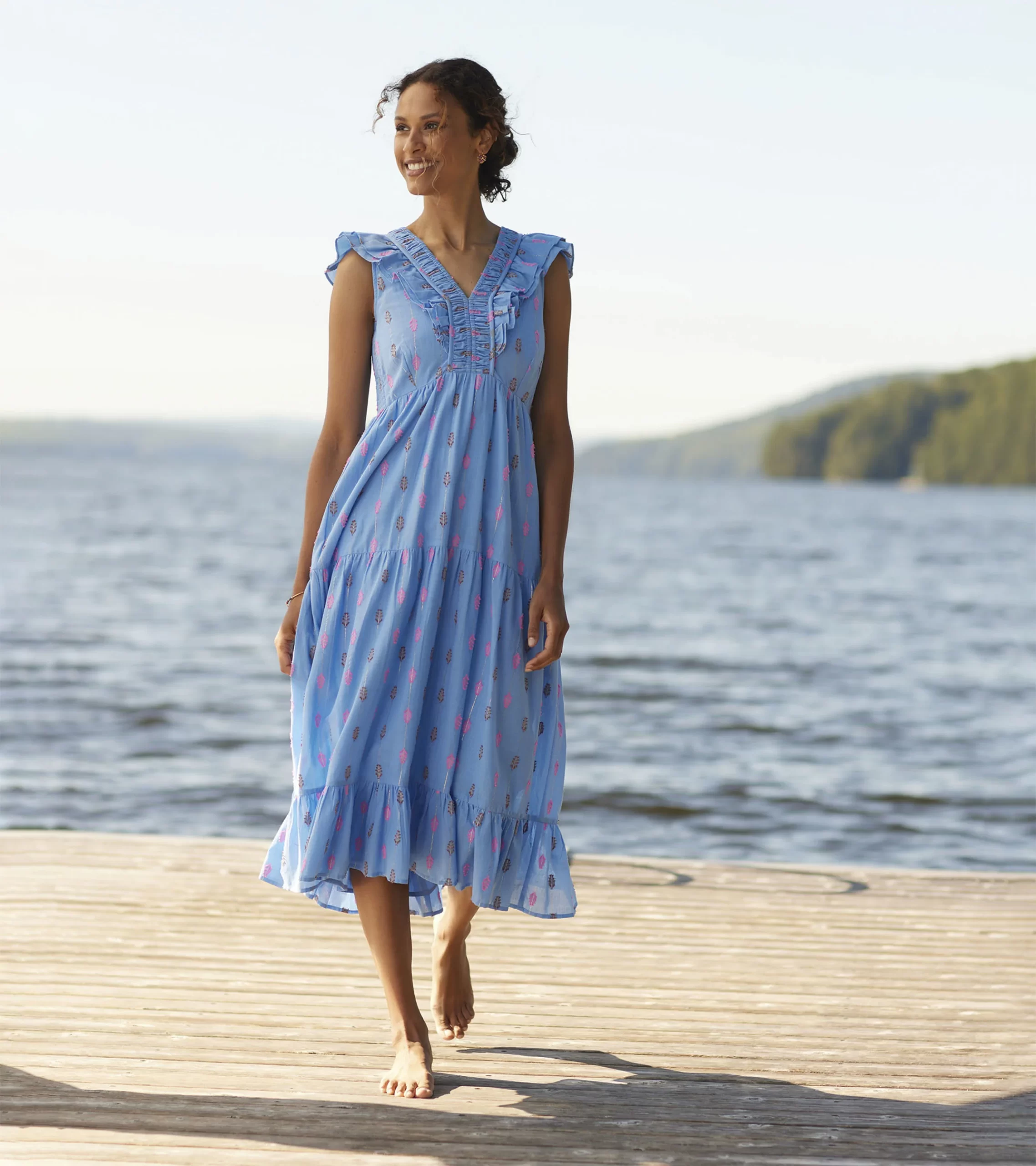 An empire waistline and tiered skirt give this midi dress a graceful fit and fluttery feel. The fully lined bodice flatters with two layers of ruffles meeting at the center V-neck, while the drapes are enhanced by soft smocking details at sides.
