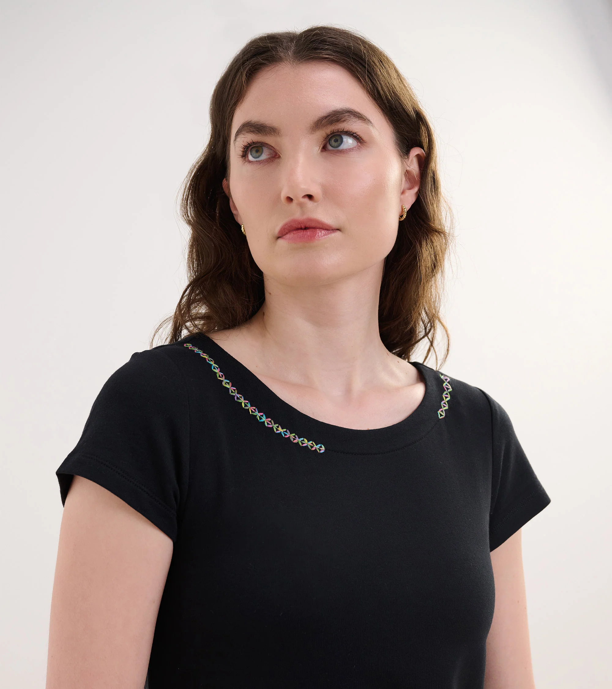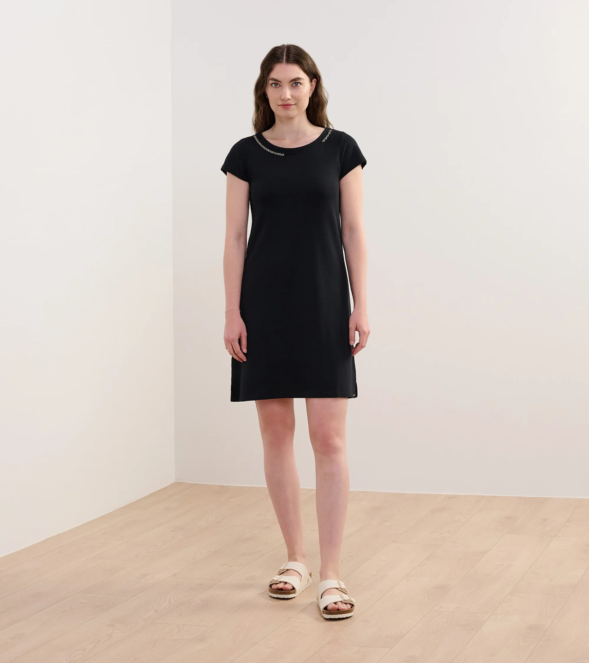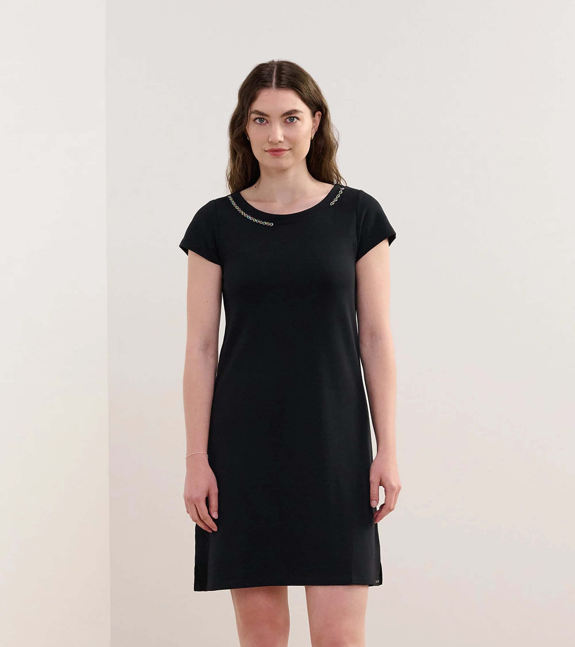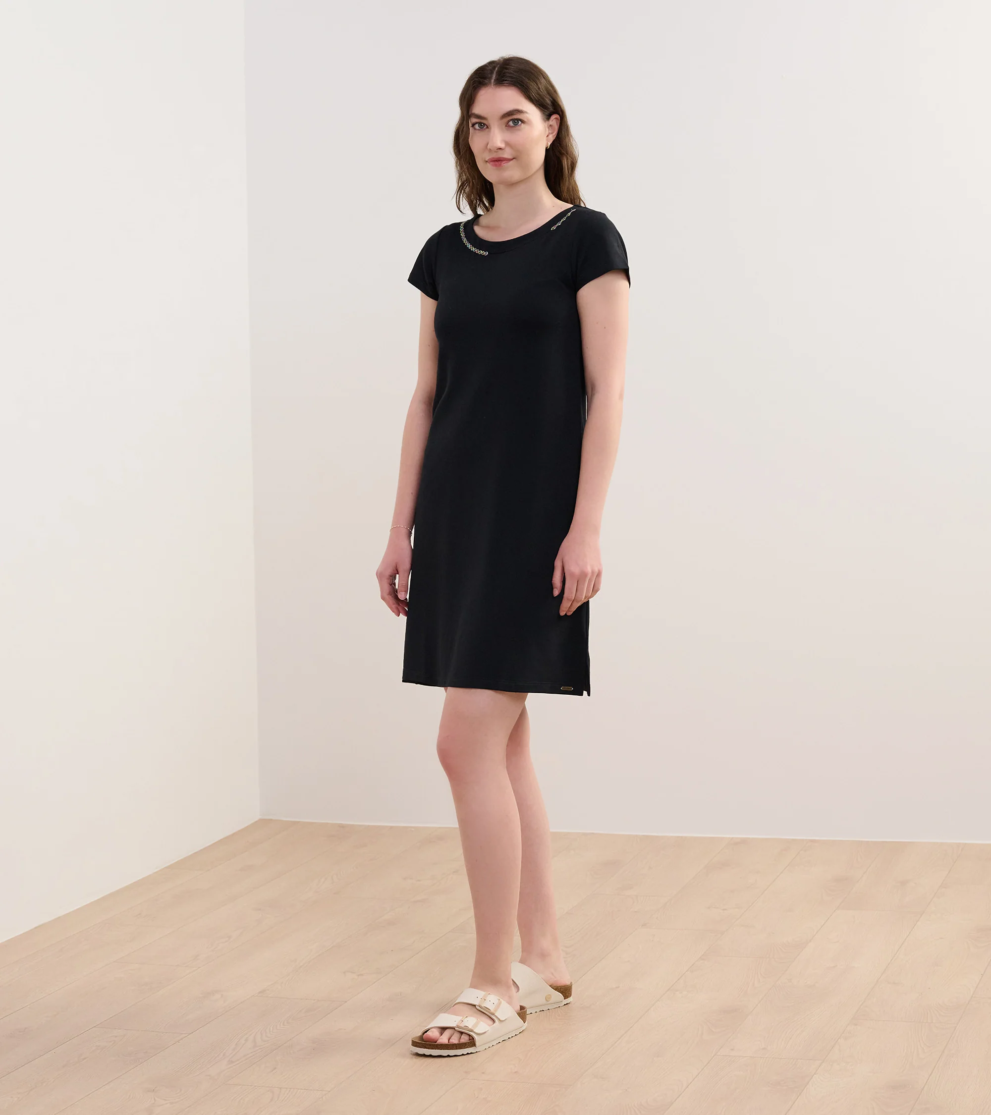 The Brooke Dress in Black French Terry is a modern take on casual elegance. Crafted from a blend of cotton, modal, and spandex, it offers a soft, stretchy feel with a flattering silhouette, an A-line skirt, cap sleeves, and subtle embroidery on the neckline. The French terry fabric provides comfort, making it perfect for day-to-night transitions. Pair it with sneakers or boots for a versatile outfit.