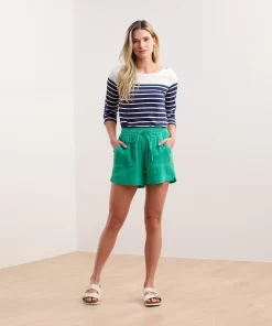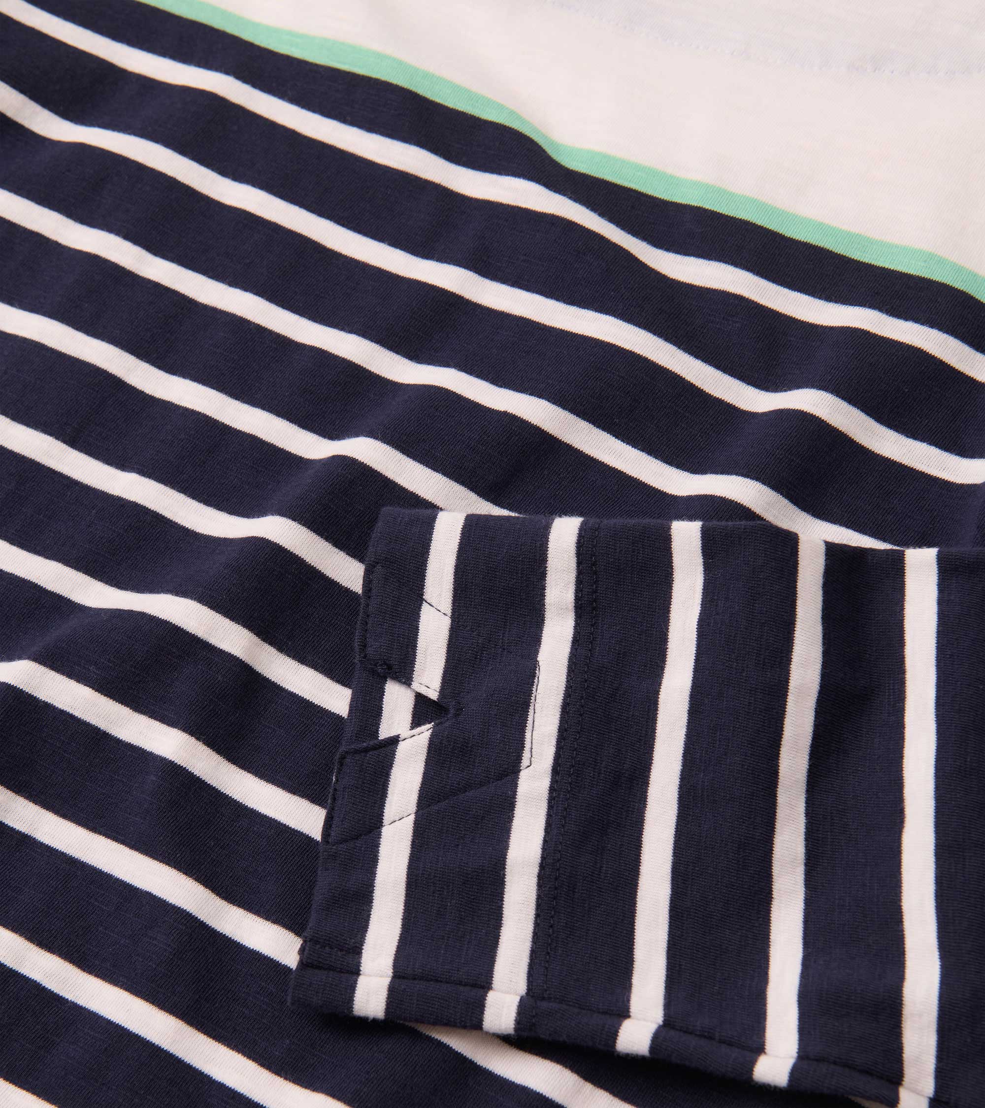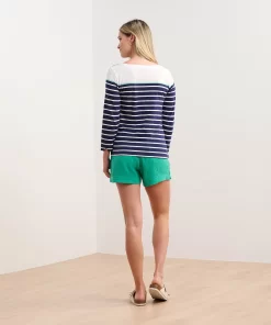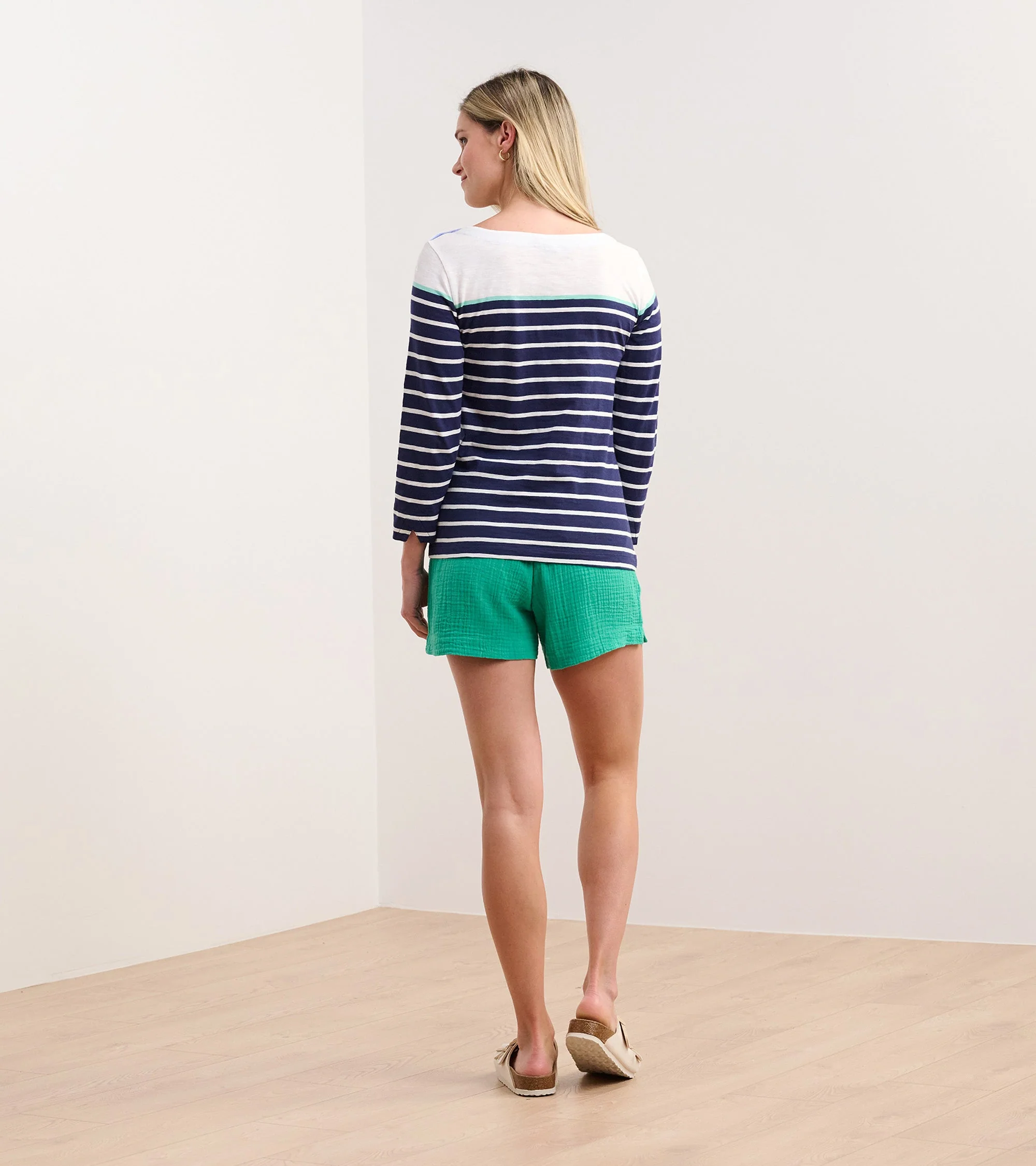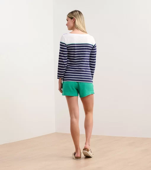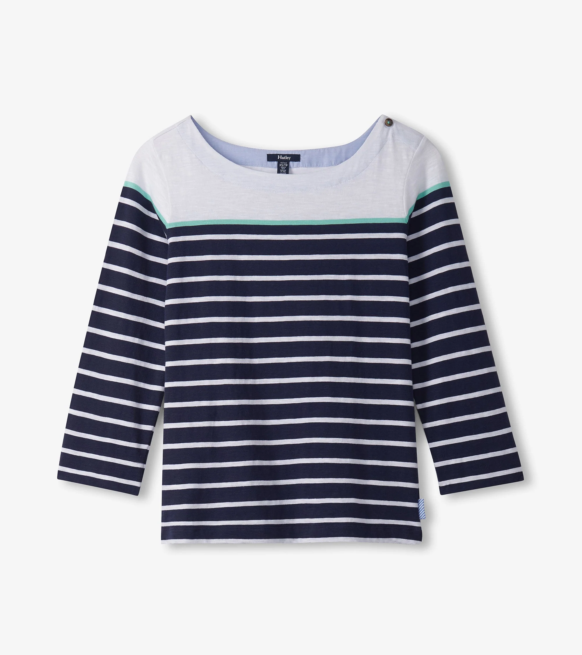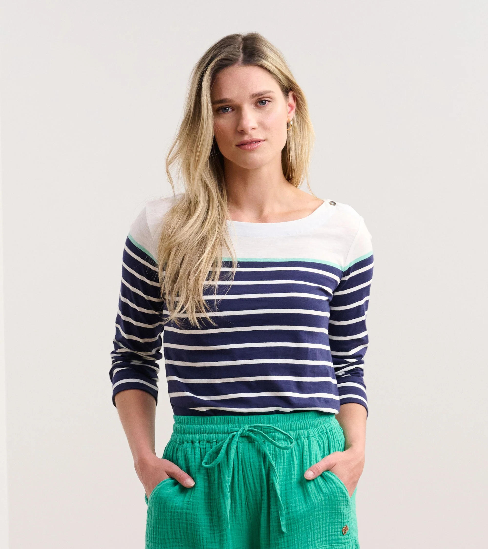 The Button Breton in Shore Stripes combines nautical charm with contemporary design. Made from soft cotton, it features a wide crew neck, 3/4 notch sleeves, timeless stripes, an interior chambray trim, and button accents for a classic look. The versatile design pairs well with shorts or jeans for a casual day out. Comfortable and stylish, it’s a must-have for your wardrobe.
