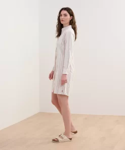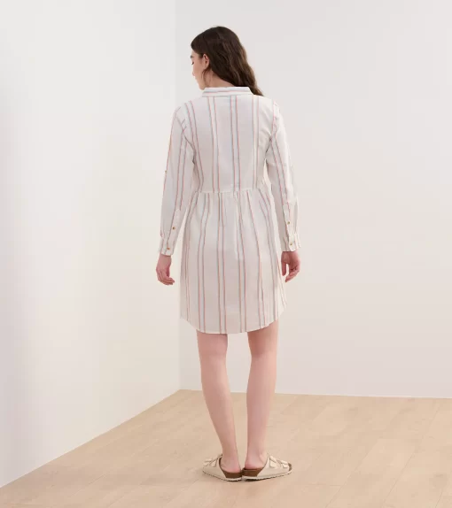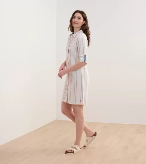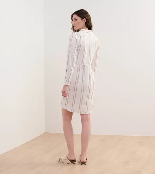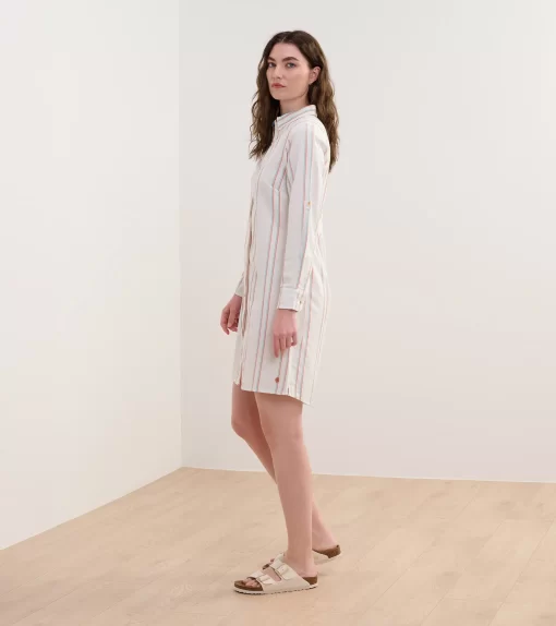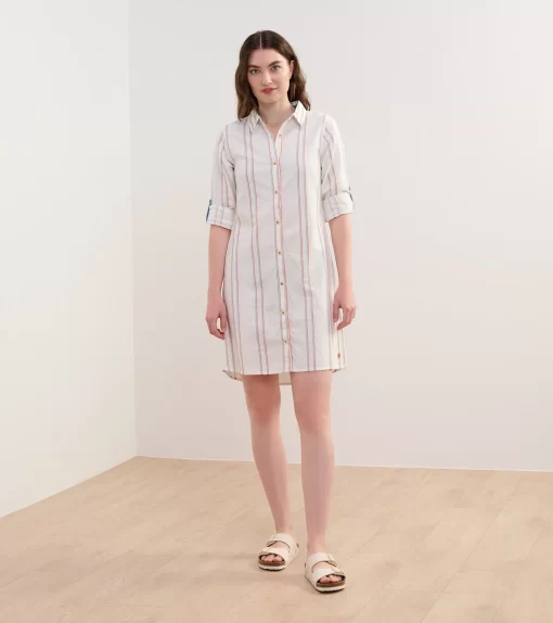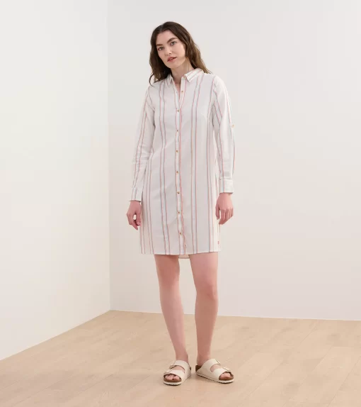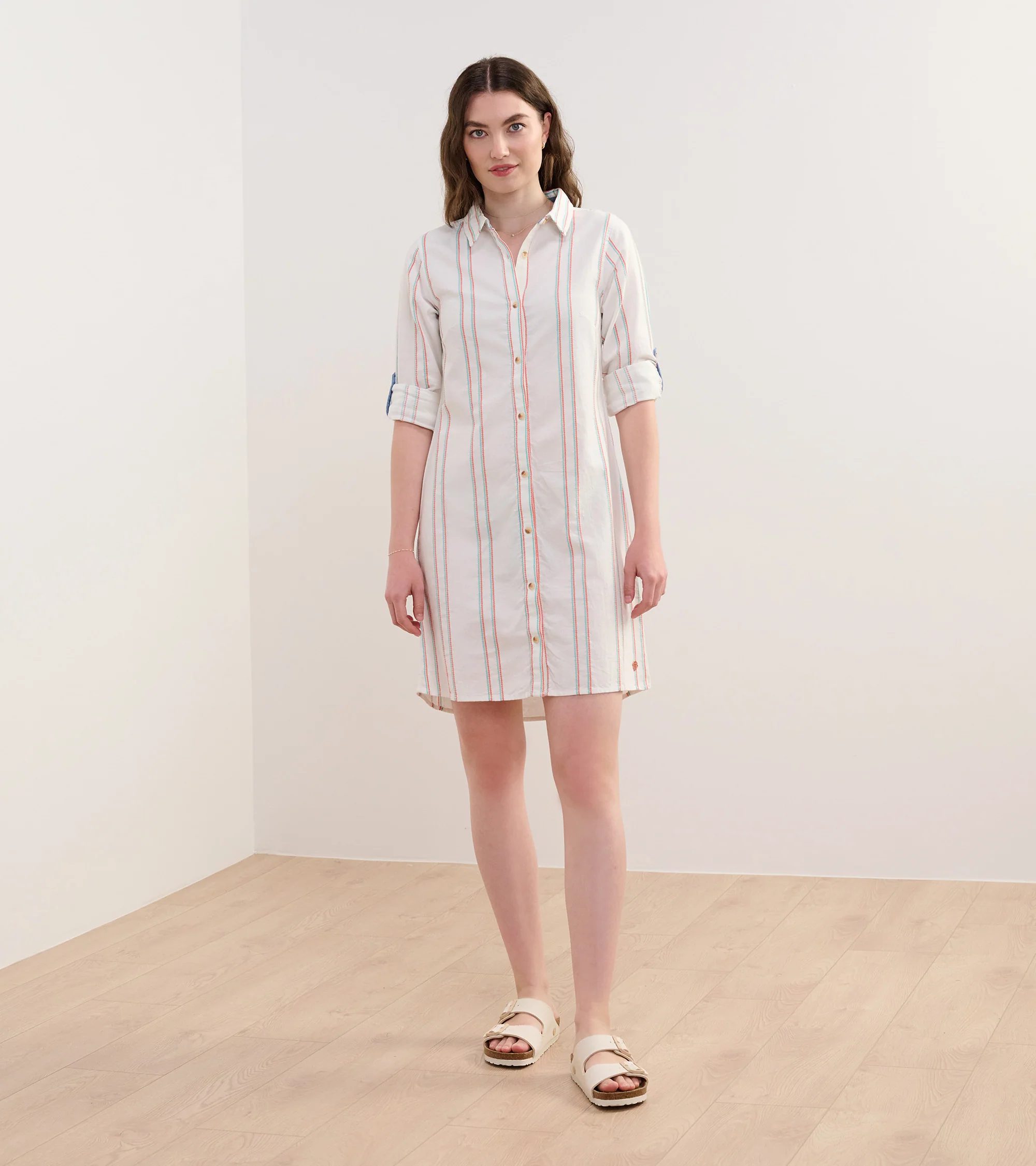 The Cara Dress in Peach Chain Stripes is a graceful blend of style and comfort. Made from breathable cotton, this dress is skirted in the back providing a flattering shape and features a roll-cuff with chambray tabs, a shirt-tail hem, a button-front design, and an eye-catching striped pattern. The peach tones bring a warm, sunny vibe, perfect for daytime outings or casual gatherings. Pair it with flats for a polished yet relaxed look.