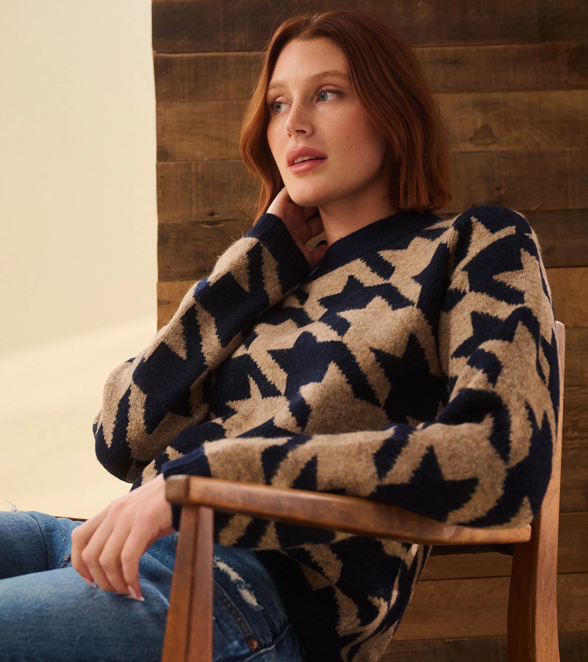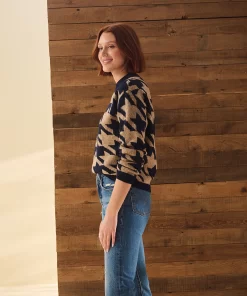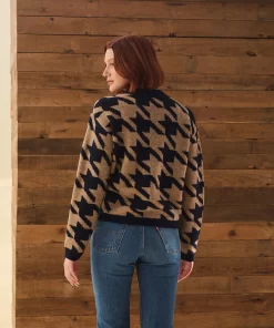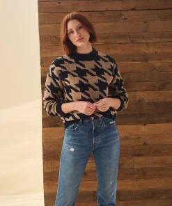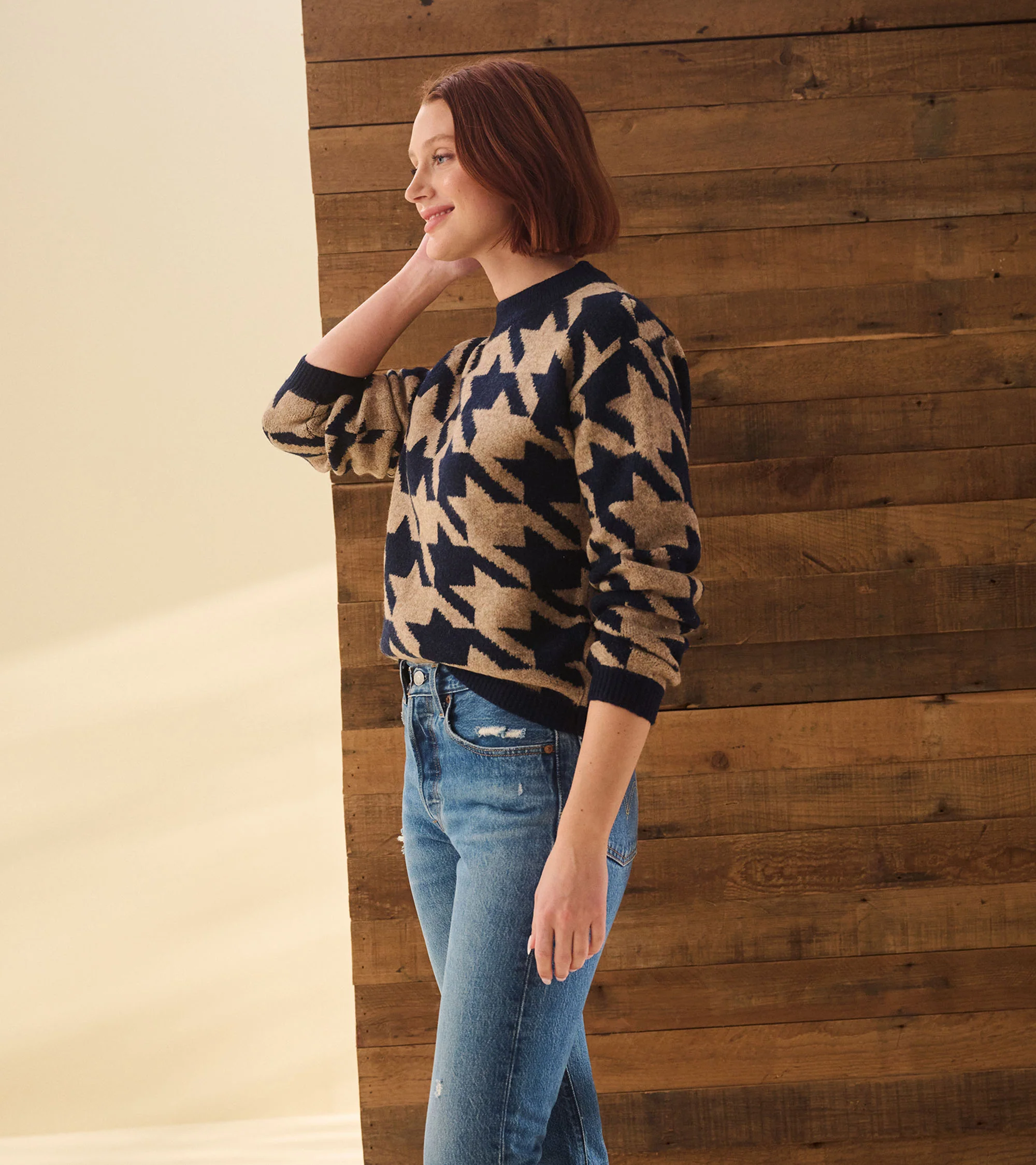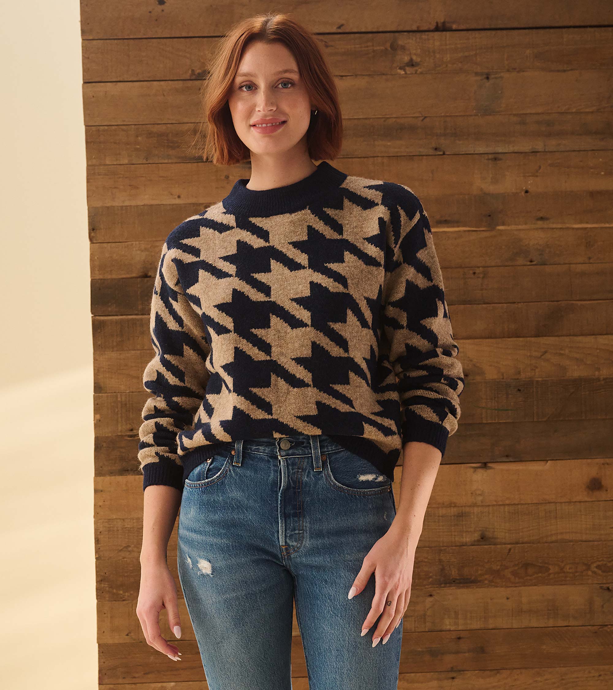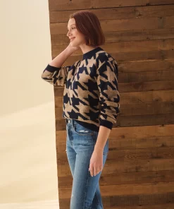 In large houndstooth, the Carmi Pullover offers a striking and modern take on a classic pattern. Crafted from acrylic, nylon, and spandex, it provides a comfortable and flattering fit. The bold houndstooth design makes it a standout piece for both casual and dressier occasions.