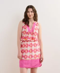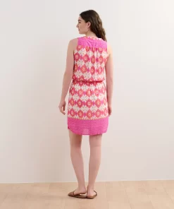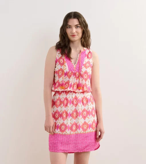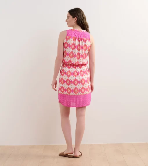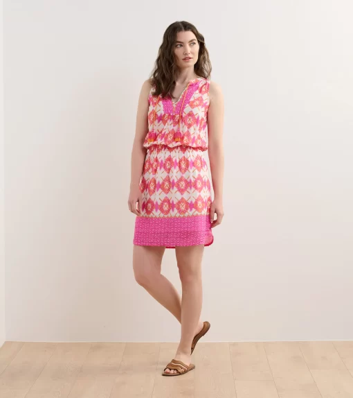 The Chloe Dress in Sunburst radiates warmth and charm. Crafted from soft and light modal, it features a smocked blouson waist, a shirttail hem, a lined skirt, contrasting fabric at the hem and neckline, tassels on the neckline, and a vivid, sunburst-inspired pattern that energizes any outfit. The flattering fit and lightweight fabric makes it perfect for both casual days and special occasions. Add simple accessories to let the dress shine.