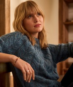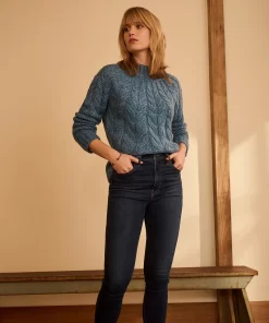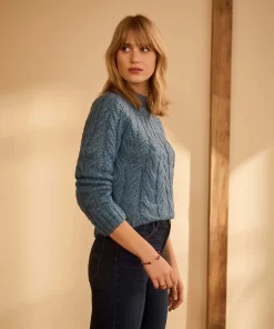The Dylan Cable Knit Sweater in blue heather is crafted from acrylic, cotton, and polyester, providing both softness and warmth. The classic cable knit design is elevated by the subtle blue heather color, making it a versatile piece for both casual and dressier occasions.