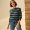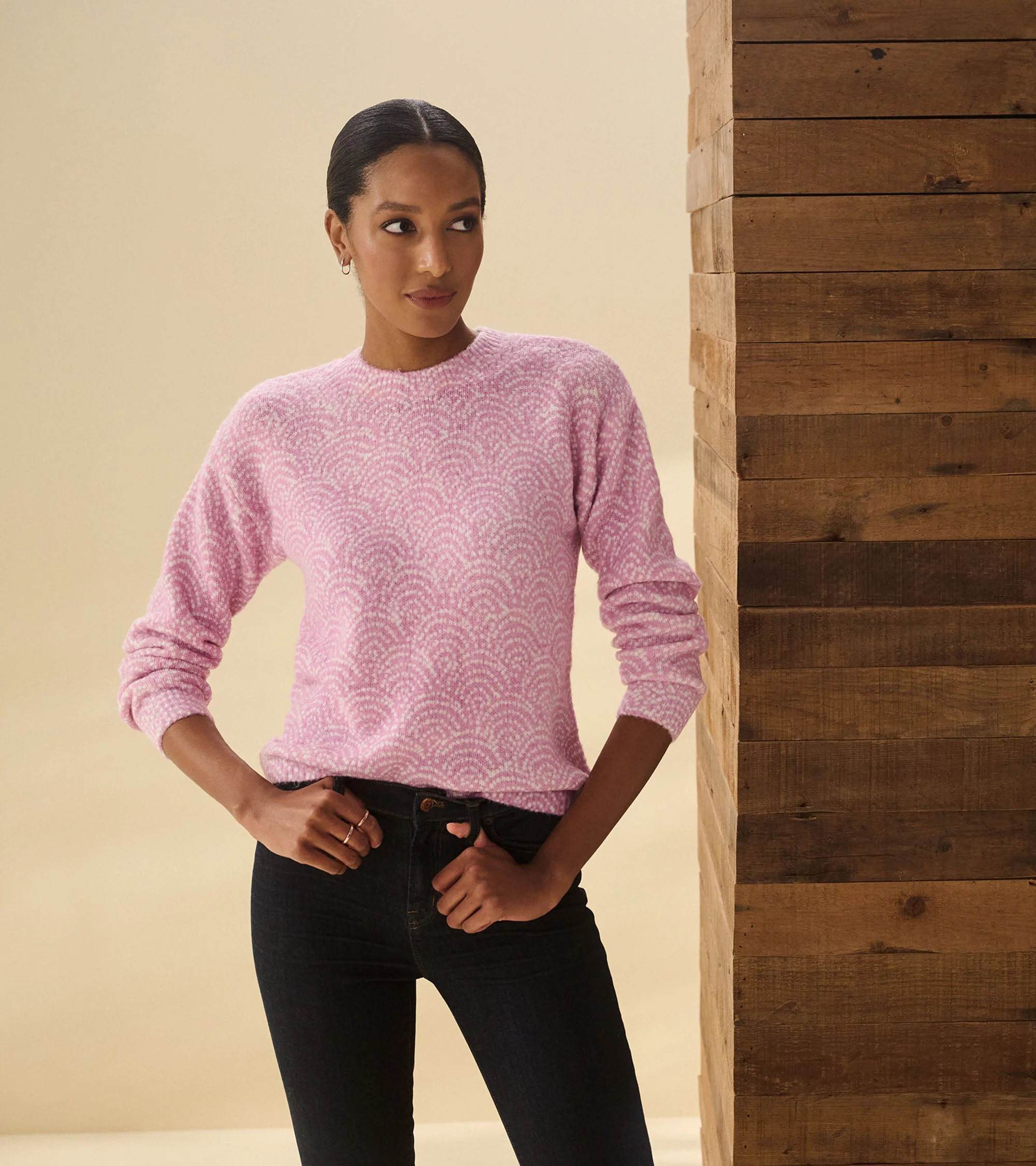 In deco dots, the Ella Sweater offers a vintage-inspired look with modern comfort. Made from acrylic, nylon, and spandex, this sweater provides both softness and stretch. The playful dot pattern adds a whimsical flair, making it a versatile piece for any occasion.