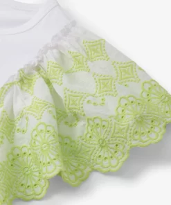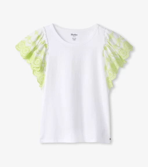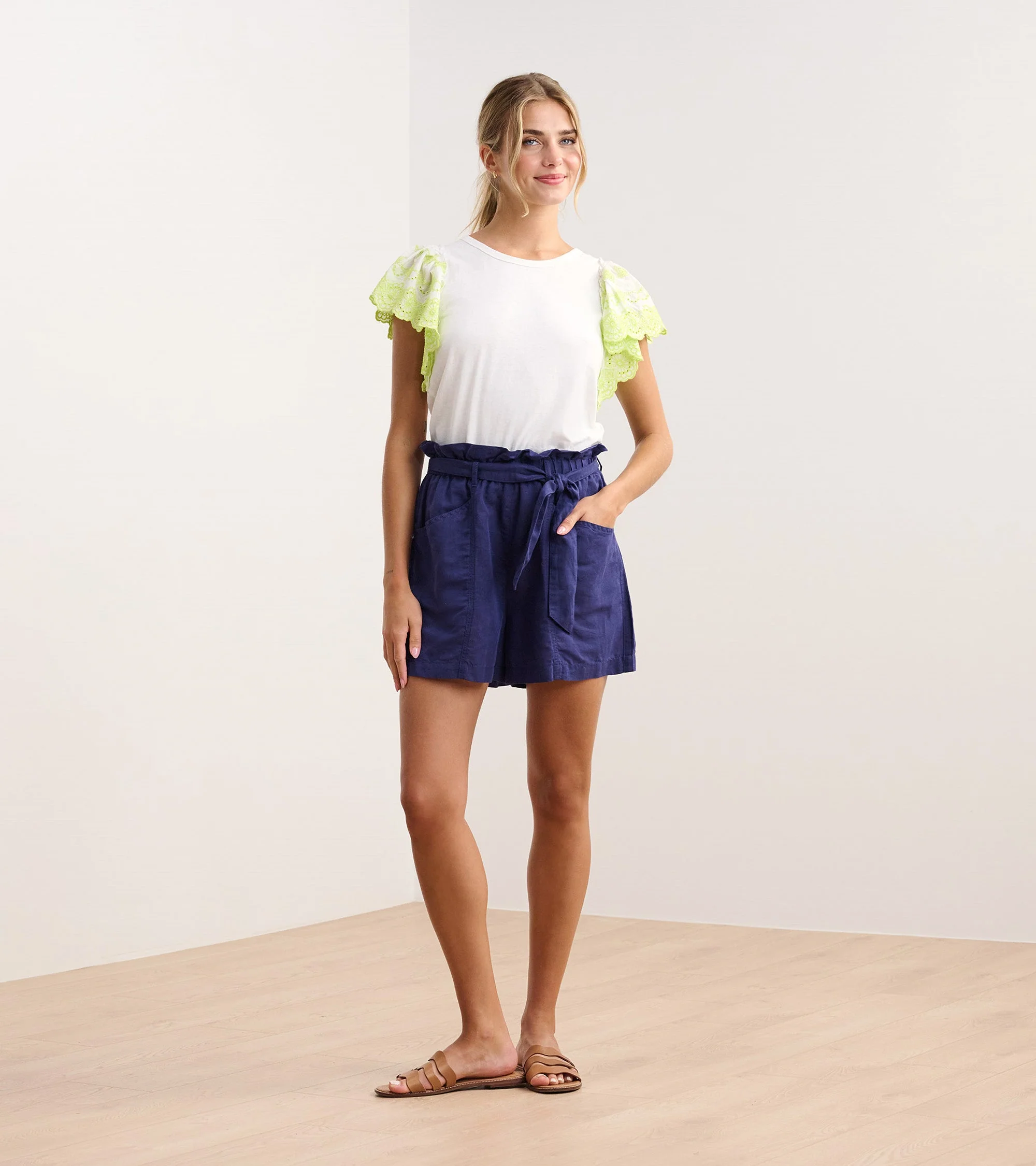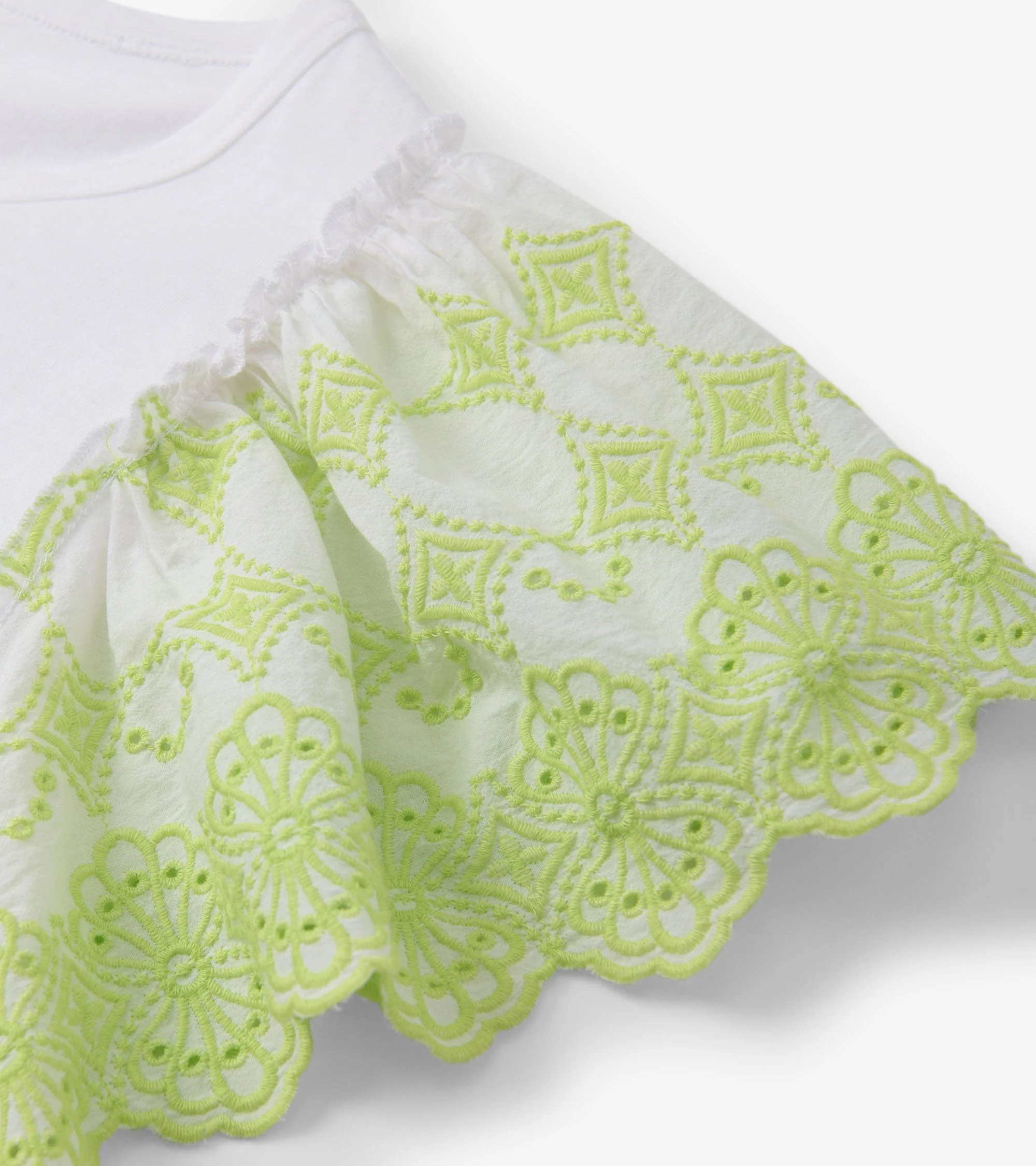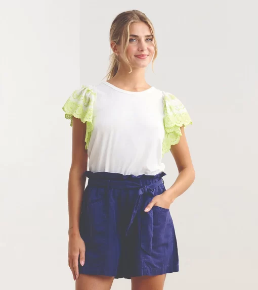 The Eyelet Sleeve Tank in White is a timeless staple with a stylish twist. Made from cotton and linen, it features intricate ruffle sleeves with eyelet detailing in a contrasting green for added texture. The crisp white shade ensures effortless versatility, perfect for pairing with colorful skirts or neutral pants. A go-to choice for polished, warm-weather looks.