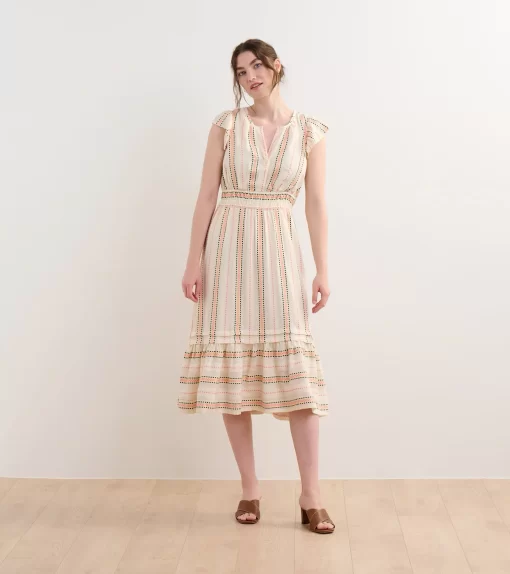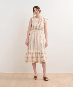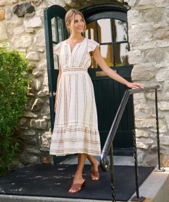 The Fiona Dress in Ribbon Weave Stripes is a refined option for any occasion. Made from a viscose and cotton blend, this fully-lined dress offers a soft breathable feel, subtle flutter sleeves, a two-tiered layered skirt, a hook and eye closure at the bust, and an elegant midi silhouette. The ribbon weave stripe pattern adds unique texture and sophistication while the horizontal stripes on the hem add variation. Style it with heels or flats for a versatile and polished look.