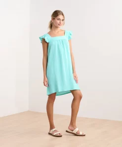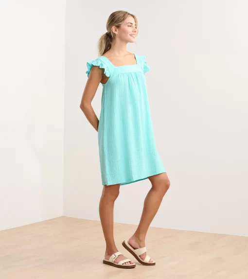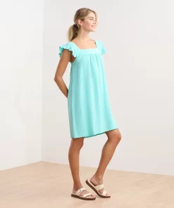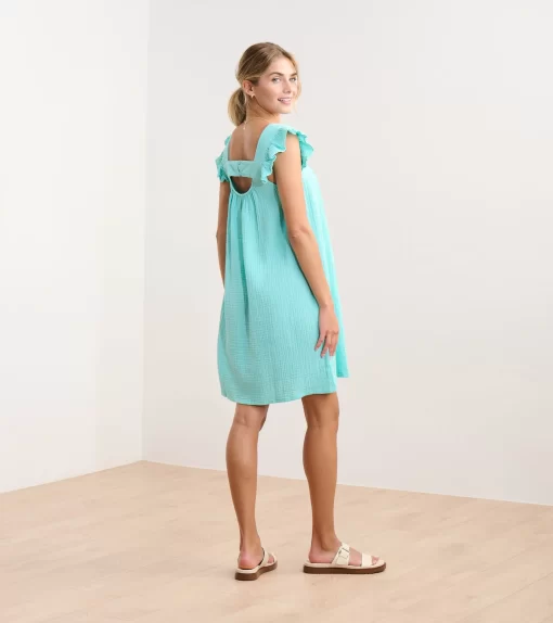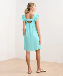 The Flutter Sleeve Dress in Aruba Blue is a delightful combination of elegance and comfort. Made from lightweight bonded cotton, it features a square neckline, a cut-out back detail, a flattering trapeze silhouette, and soft flutter sleeves that add a playful charm. The vibrant Aruba Blue hue and wrinkled look make it perfect for daytime events and traveling. Dress it up with heels or keep it casual with sandals.