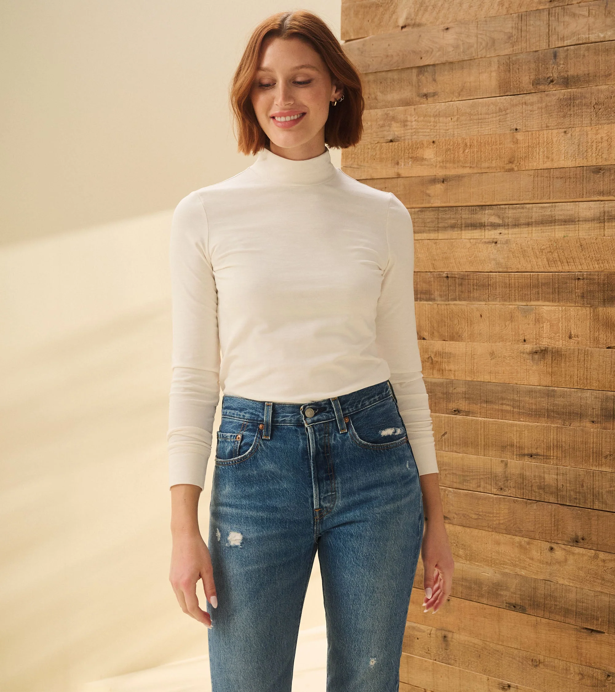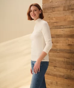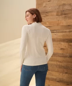 This cream white mock neck top is crafted from a blend of cotton, modal, and spandex, providing a soft and comfortable fit. The mock neck adds a touch of sophistication, while the neutral color makes it easy to pair with any outfit. A versatile piece for layering or wearing on its own.