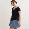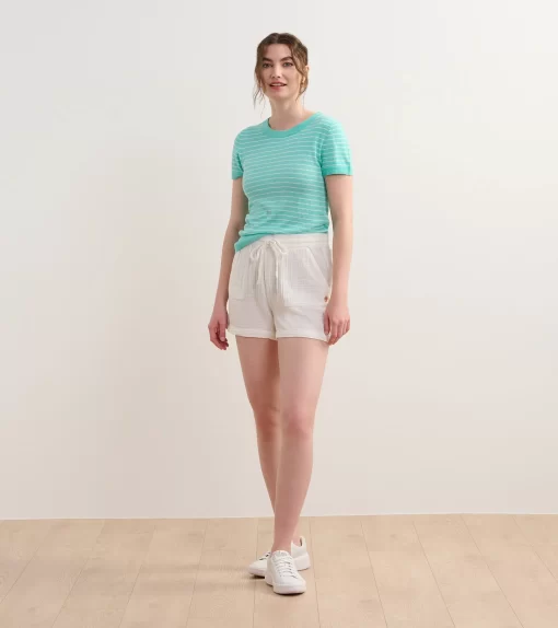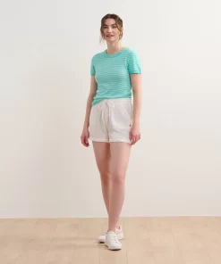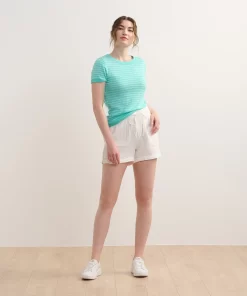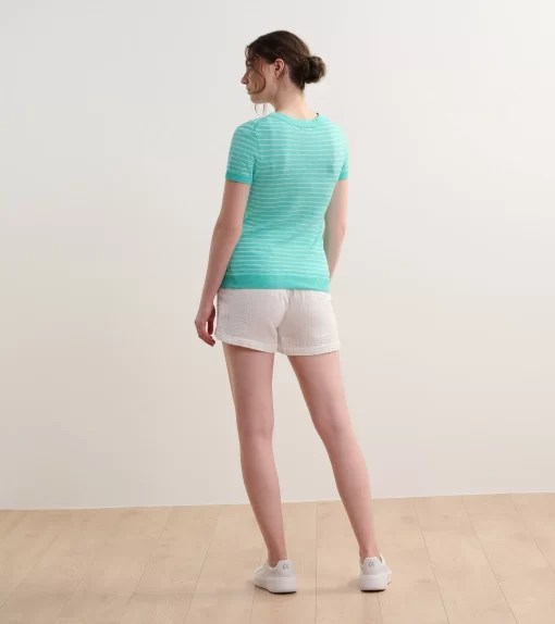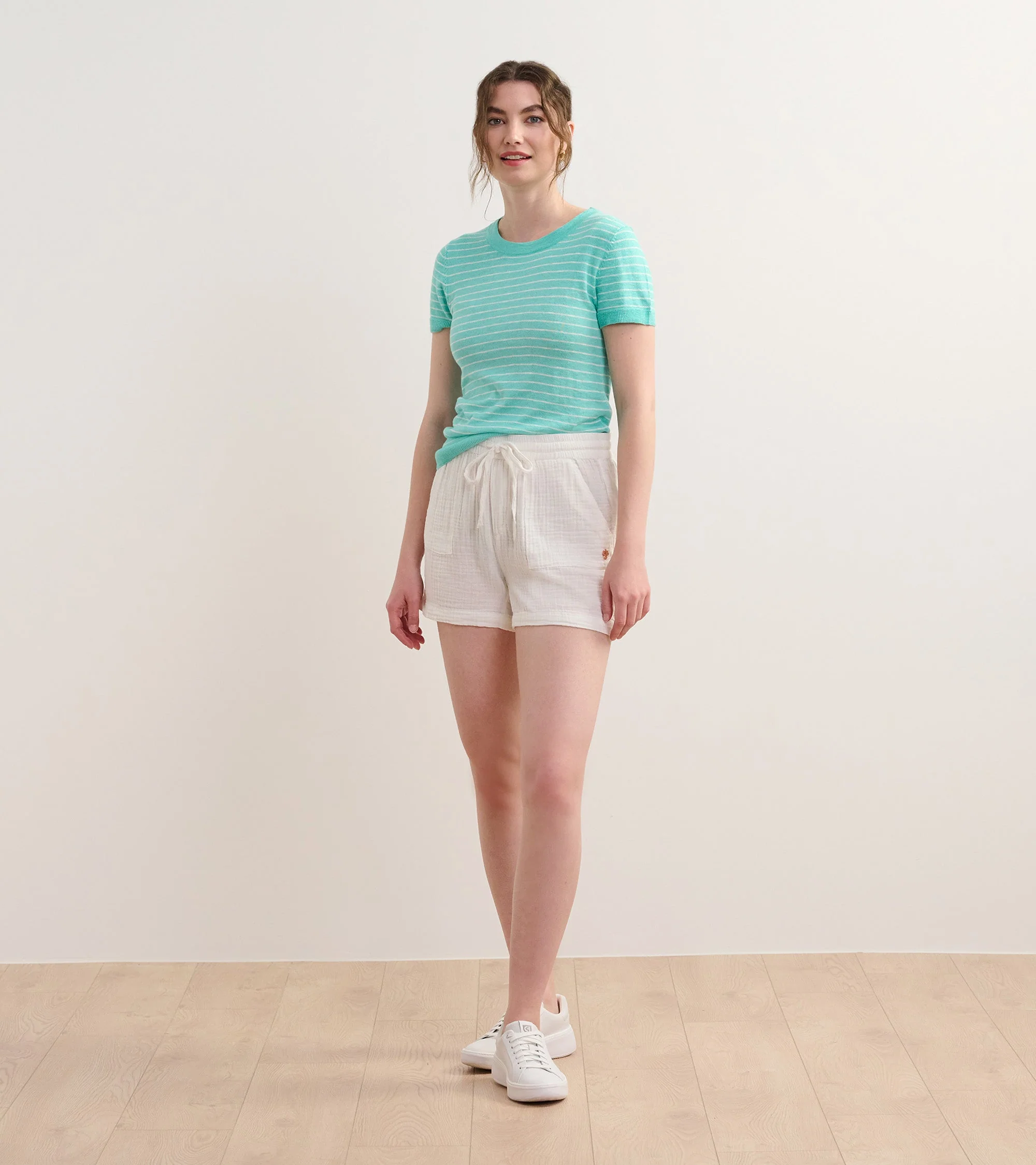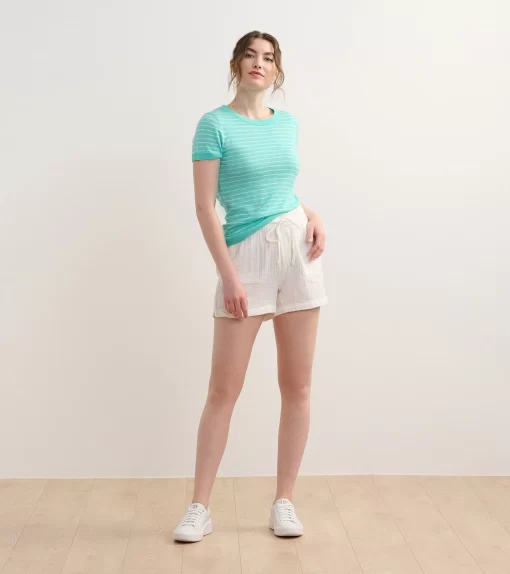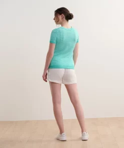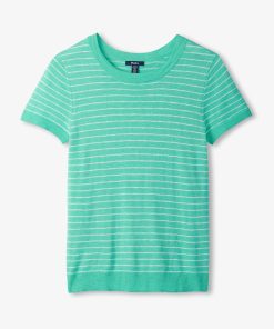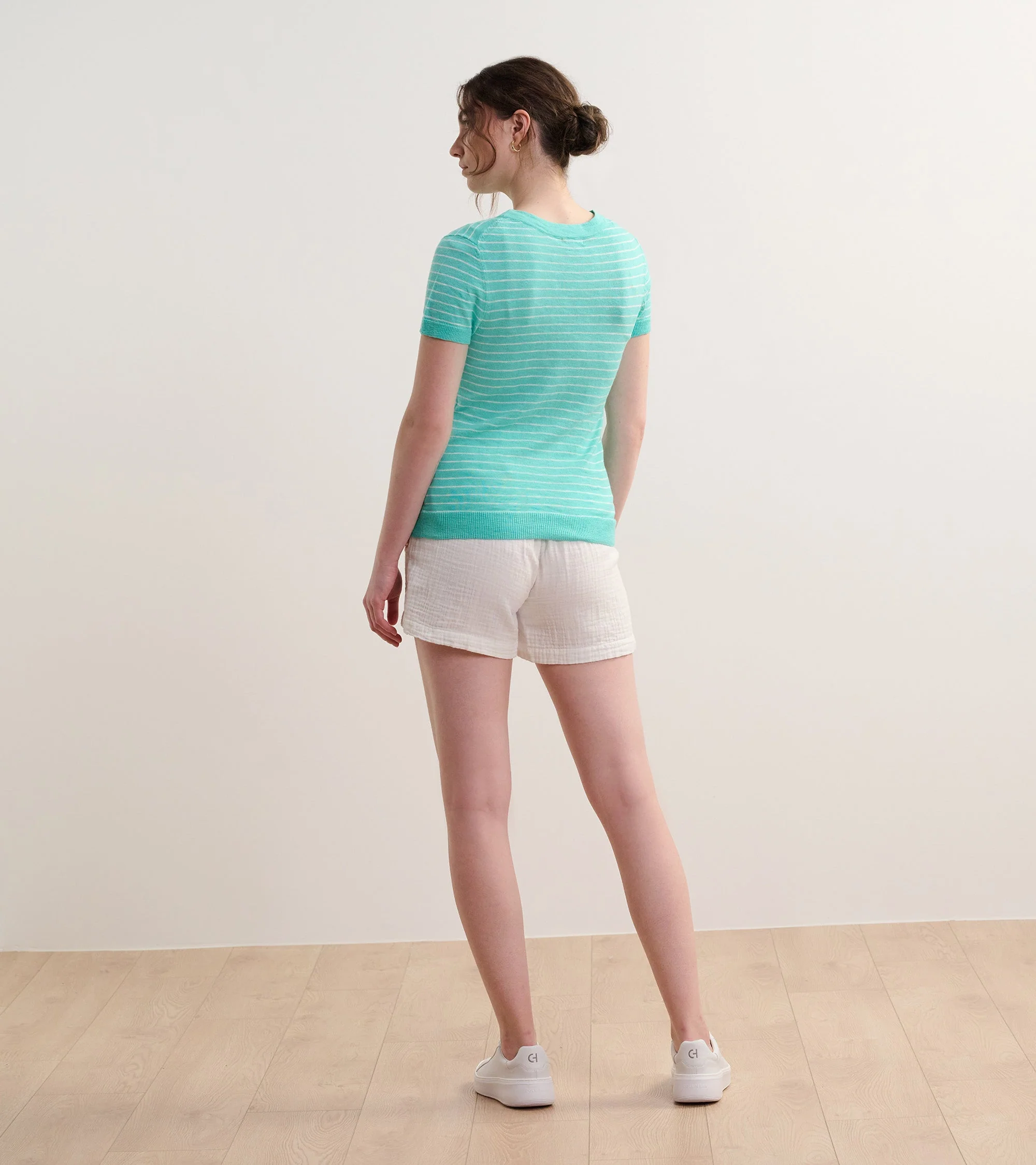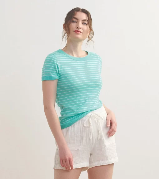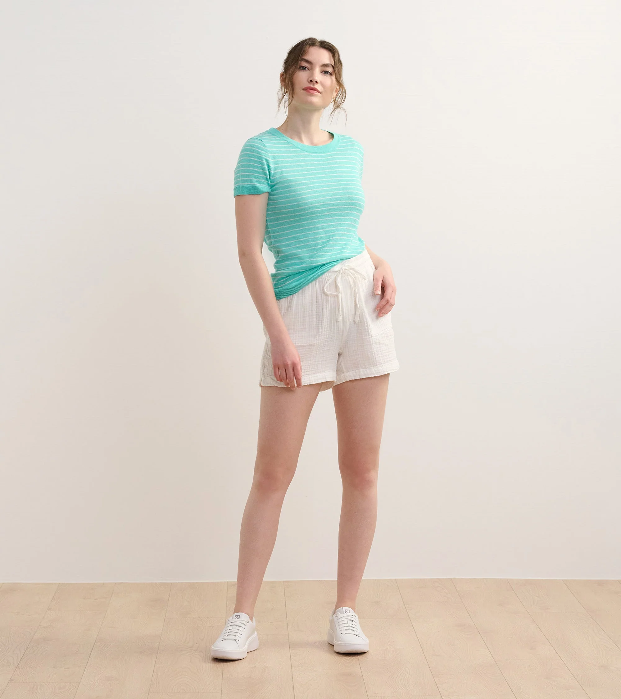The Simone Tee in Teal Stripes brings a refreshing pop of color to your wardrobe. Made from a breathable cotton and viscose blend, this fine-gauge knit tee features a soft, significant lightweight feel and a flattering fit. The teal stripe design adds a modern touch to this classic silhouette. Perfect for layering or wearing solo, it pairs beautifully with denim or neutral bottoms.