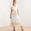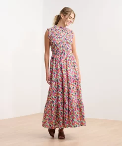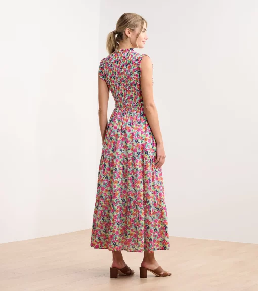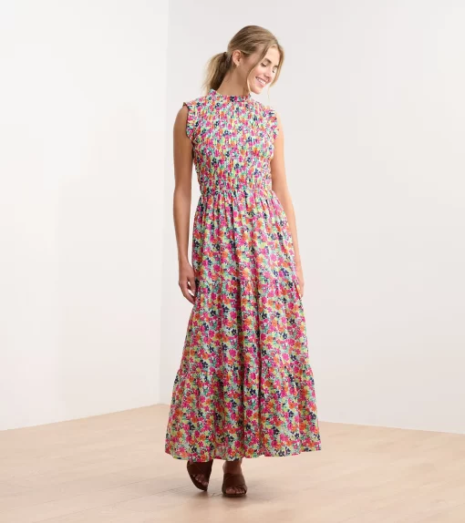 The Smocked Maxi Dress in Fresh Flowers is a stunning option for warm-weather occasions. Made from breathable cotton, this fully-lined full-length sleeveless dress features a smocked bodice and a three-tiered skirt for a flattering fit. The vibrant floral design captures the essence of spring and summer. Pair it with sandals or wedges for an effortlessly elegant outfit.