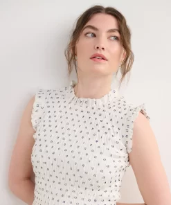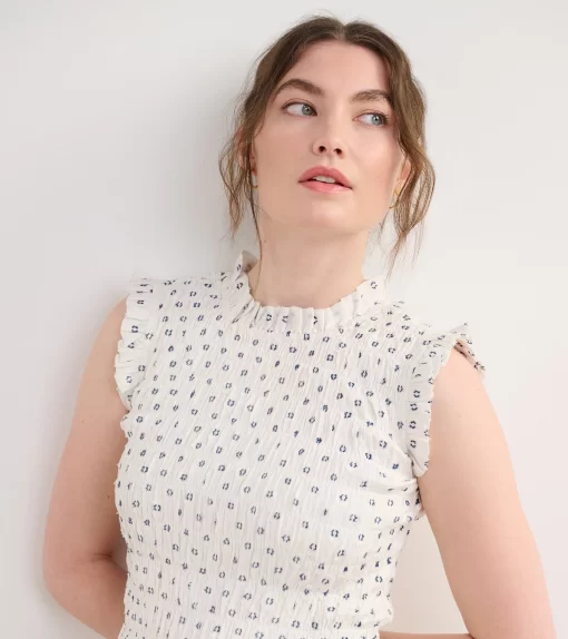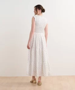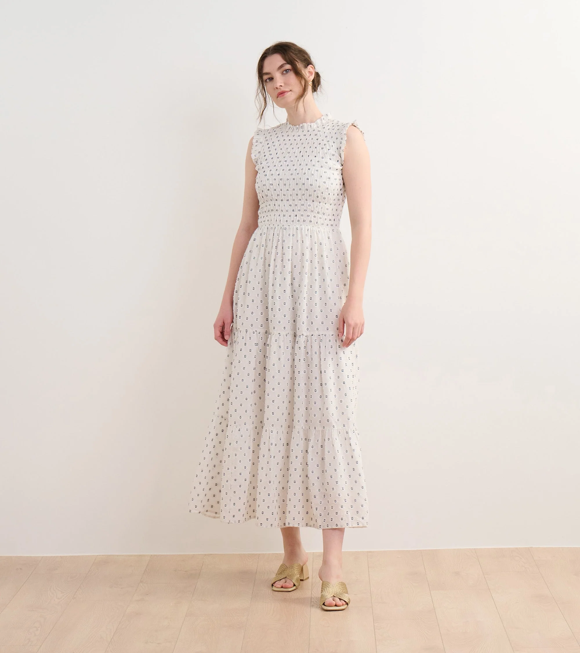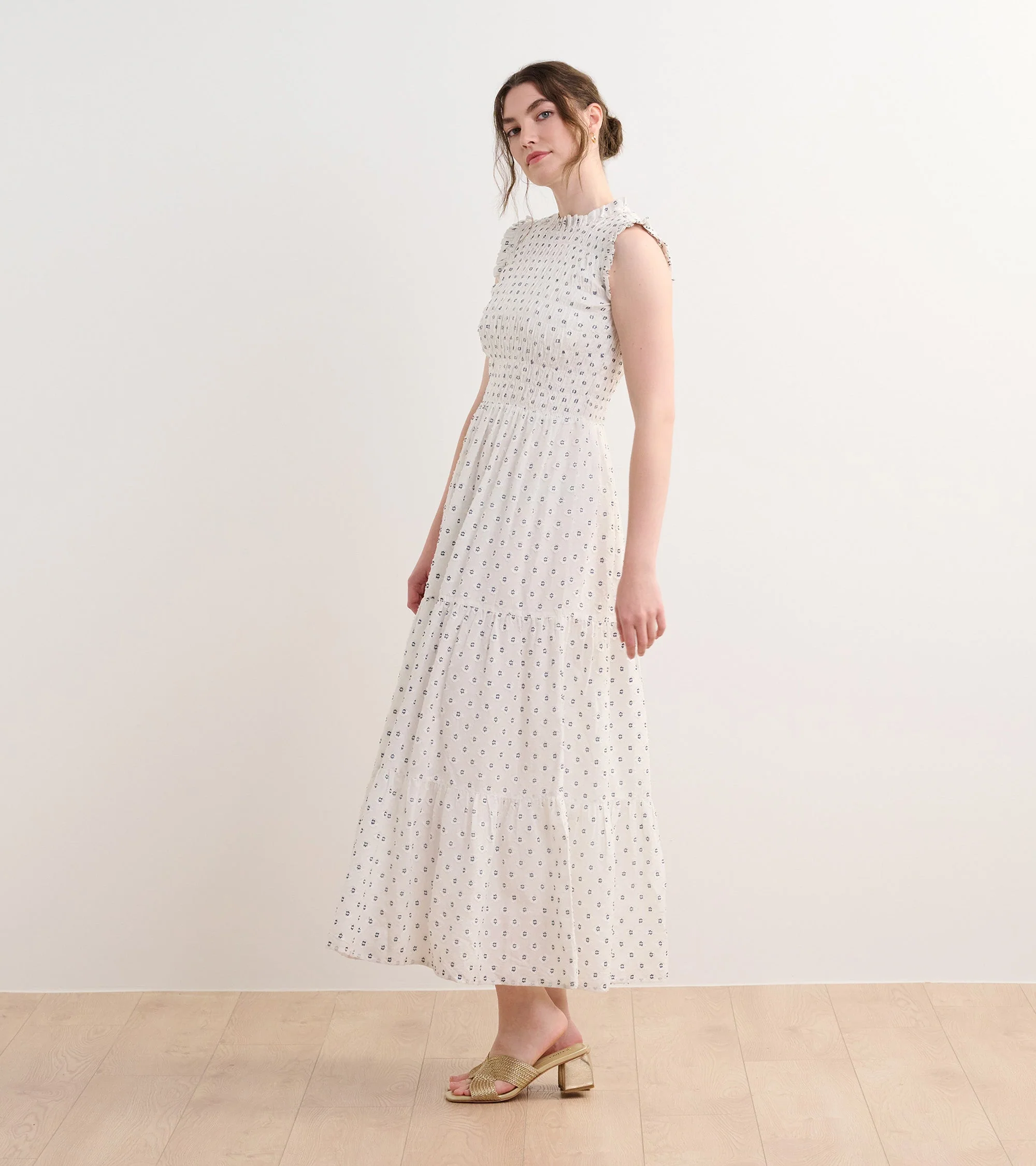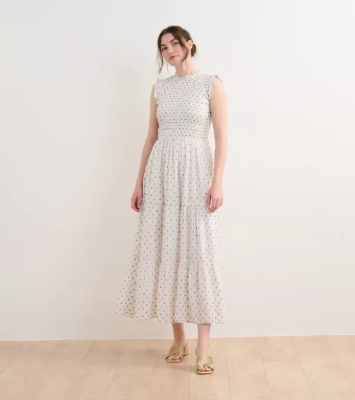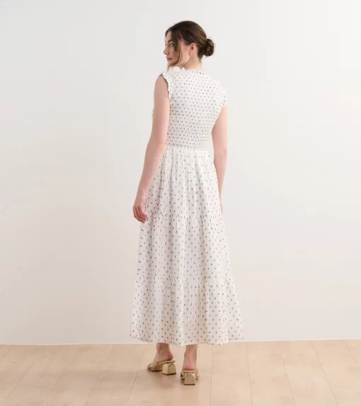 The Smocked Maxi Dress in Navy Spots is an elegant yet comfortable fully-lined option for special occasions. Made from a blend of viscose, polyester, and nylon, this fully lined dress features a smocked bodice for a flattering fit, a ruffled neckline, a three-tiered skirt, and a flowing silhouette. The playful spotted design in navy tones adds a modern edge. Style it with heels or sandals for a chic, effortless outfit.
