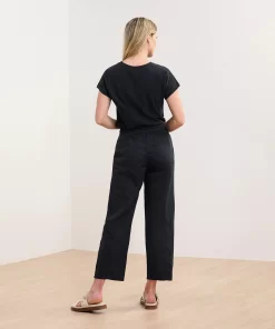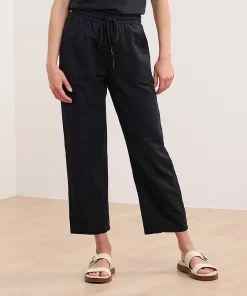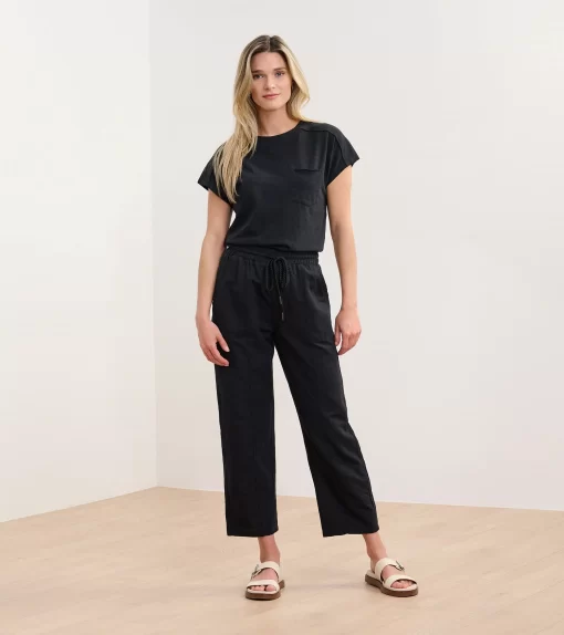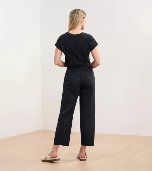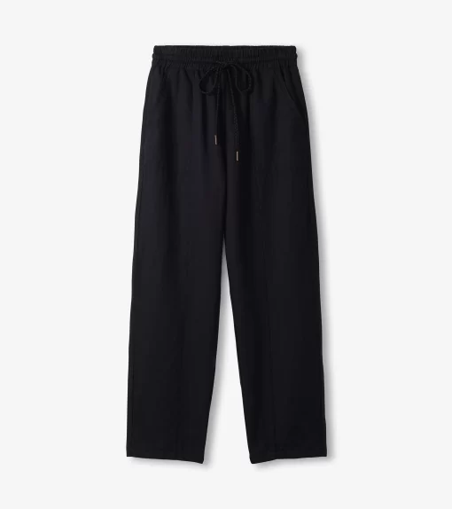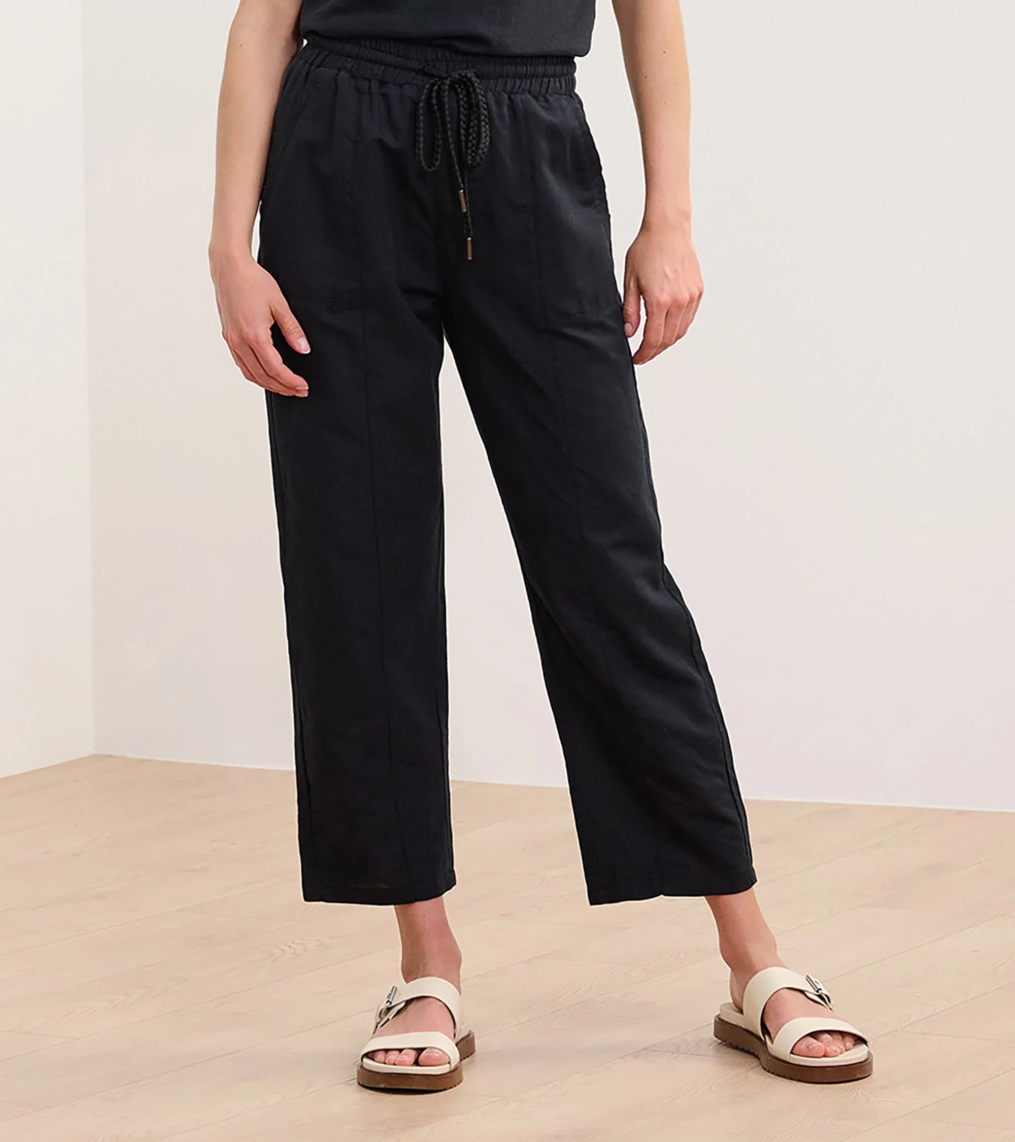 The Straight Leg Linen Pants in Black are a sophisticated choice for everyday wear. Crafted from a linen and cotton blend, this pull-on style offers an elastic waist, a functional braided draw cord, a tapered leg design, front and back patch pockets, a stylish center seam, and a sleek silhouette. The straight-leg design ensures a timeless look, making these pants perfect for both work and casual settings. Pair them with a blouse or a relaxed tee for effortless style.