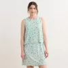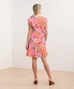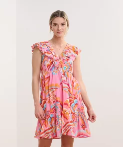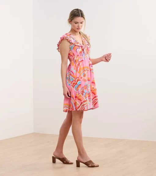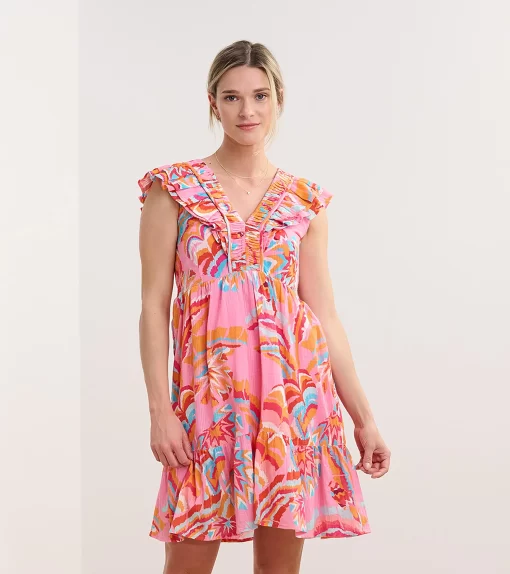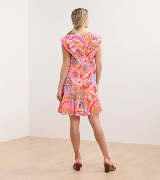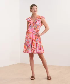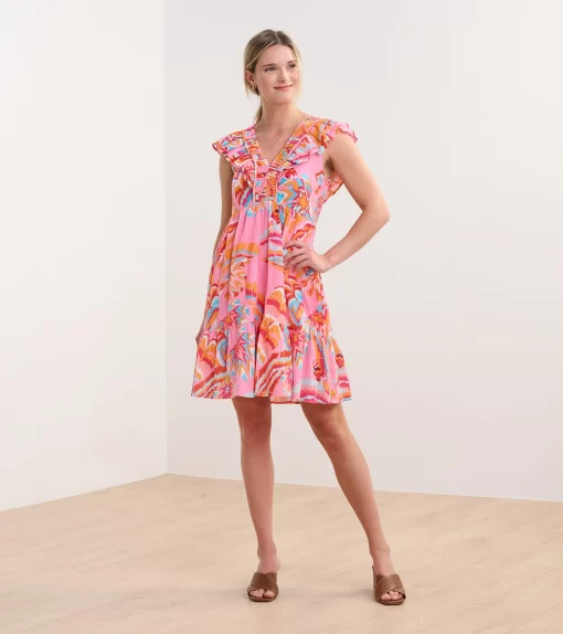 The Zoe Dress in Blooming Palms is a breezy, tropical-inspired piece. Made from cotton and viscose, this fully-lined flirty sundress features a lightweight feel, a tiered skirt, smocking at the ribs, an empire waist, and ruffled sleeves that extend down the front and back bodice for a feminine touch. The palm print brings a vibrant, summery vibe, making it ideal for vacations or outdoor gatherings. Style it with wedges or flats for a chic outfit.