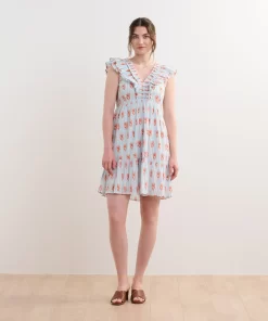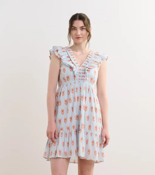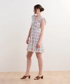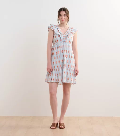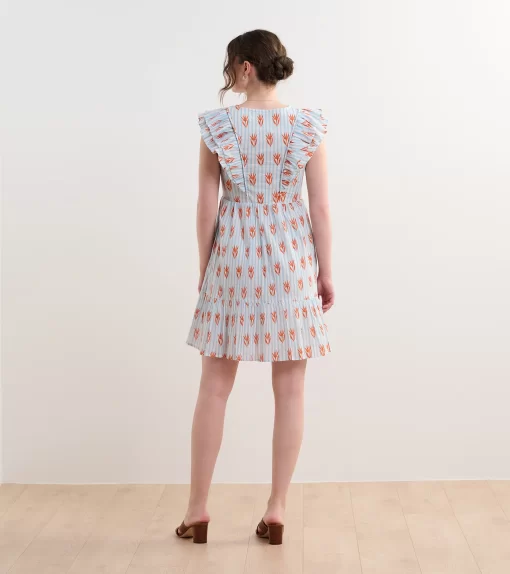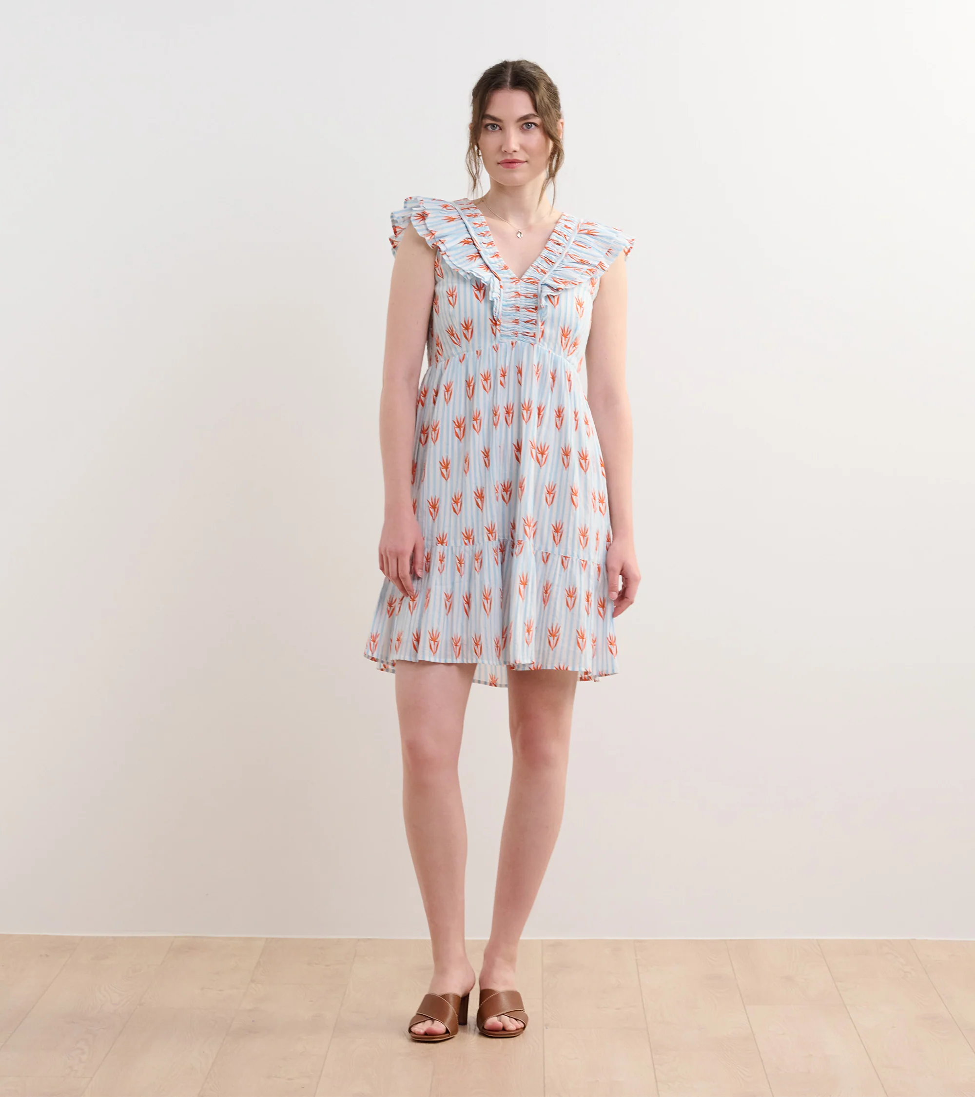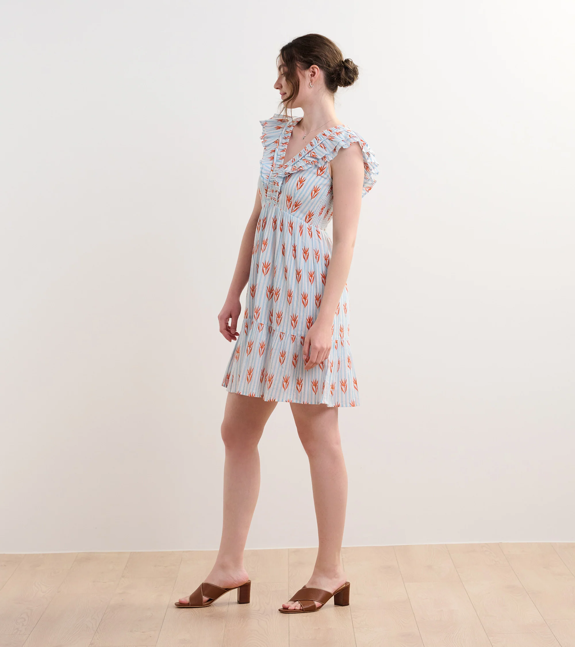 The Zoe Dress brings playful elegance with its floral-striped design. Made from lightweight cotton, this fully-lined flirty sundress features a tiered skirt, smocking at the ribs, an empire waist, and ruffled sleeves that extend down the front and back bodice for a touch of feminine charm. The breezy silhouette makes it ideal for both casual outings and evening events. Add simple accessories to complete this eye-catching look.